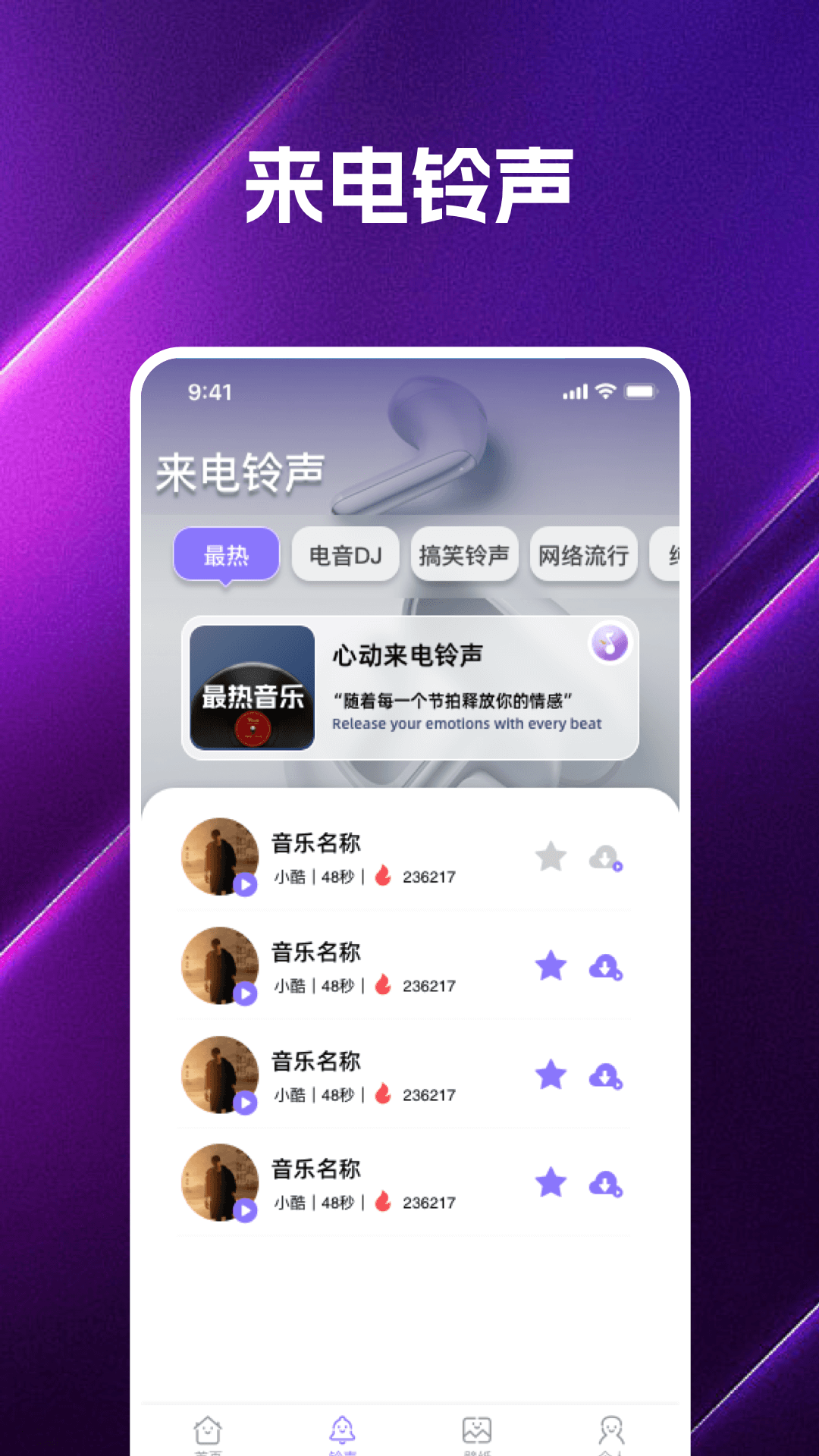 一款功能强大的手机铃声应用,海量热门铃声,一键下载设置,时下火热铃声大全,音乐铃声应有尽有,让每一次来电都成为一次视觉和听觉的享受。